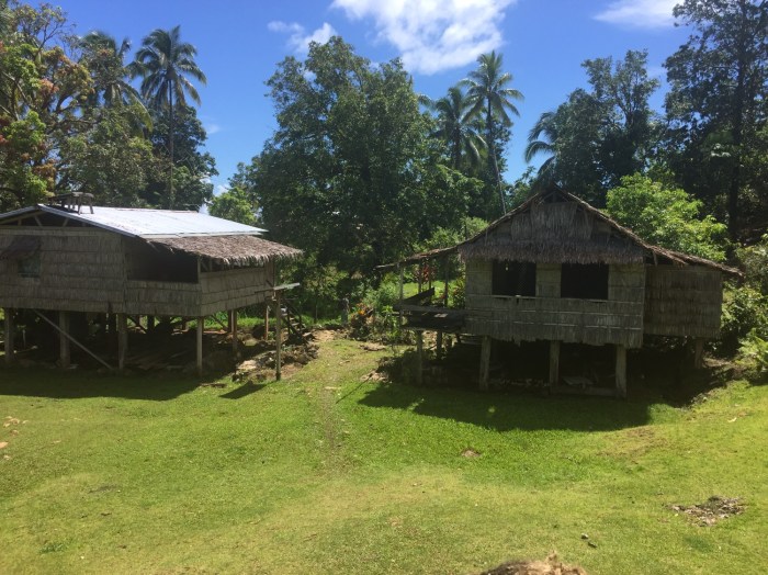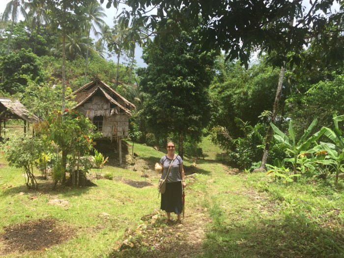 The village was beautiful. Set high in the hills, with clusters of leaf huts by crystal clear streams, the vibrant green of the grass interspersed with brightly colored flowers and plants, red, green and blue parrots in the trees and fat pigs wallowing in the mud. I could see this was a happy, well loved village. The house was luxury. We had fresh water from the stream, running from a tap shower under the house, flushing toilets, solar powered light and gas cooking facilities. We slept.