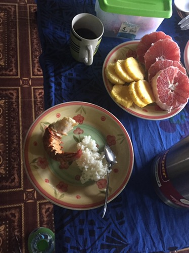 We return back to our homestay and are treated to a meal cooked by one of the chefs from Sandbis, who lives here, in Mbabanga village. We are lucky, we get to spend our last night eating the most amazing meal of fresh tuna and cray fish cooked in a delicious salty garlic butter, a creamy mash and a salad with, somebody pinch me, salad dressing!