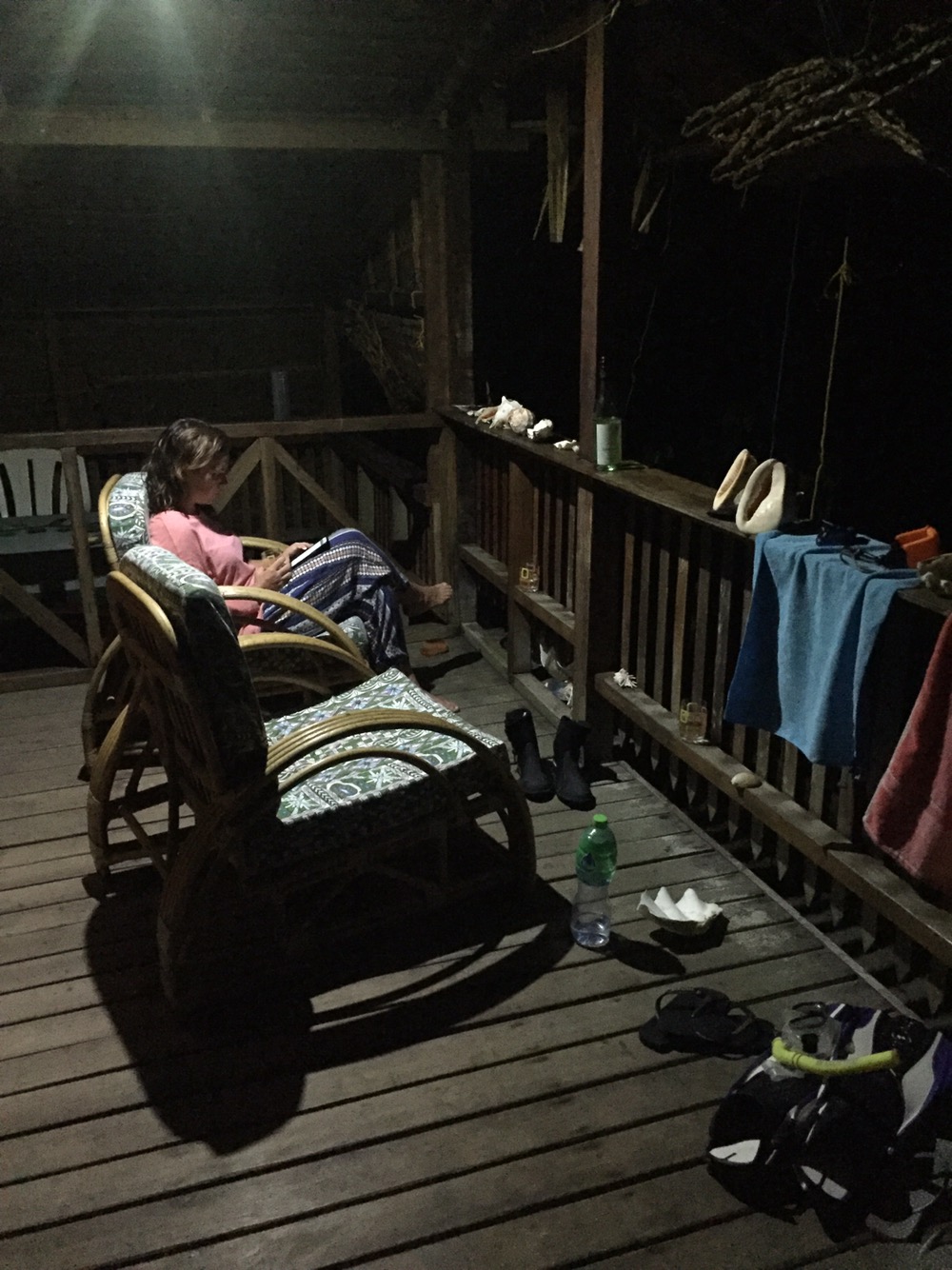 We return to the homestay to find it transformed. There is still no water, no gas, no electricity but we have a bed and a rainwater tank so we are happy. We spend the afternoon snorkelling and reading before (oh woe is me), heading up to Sandbis for another meal.